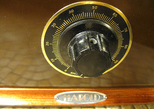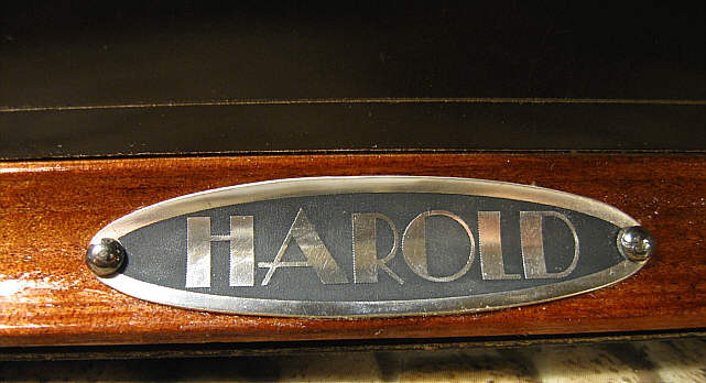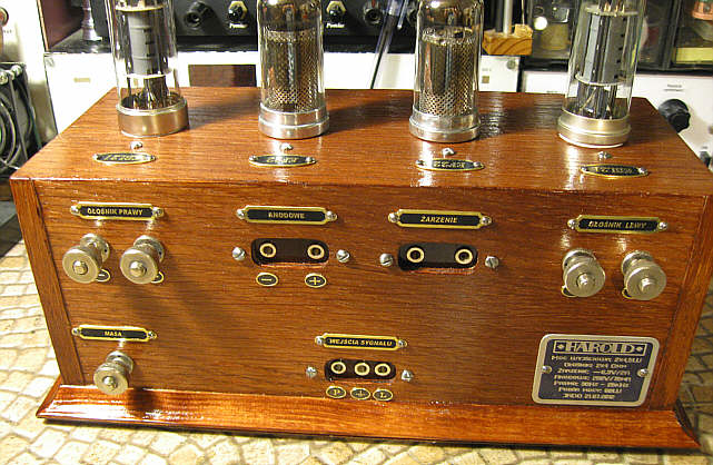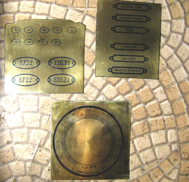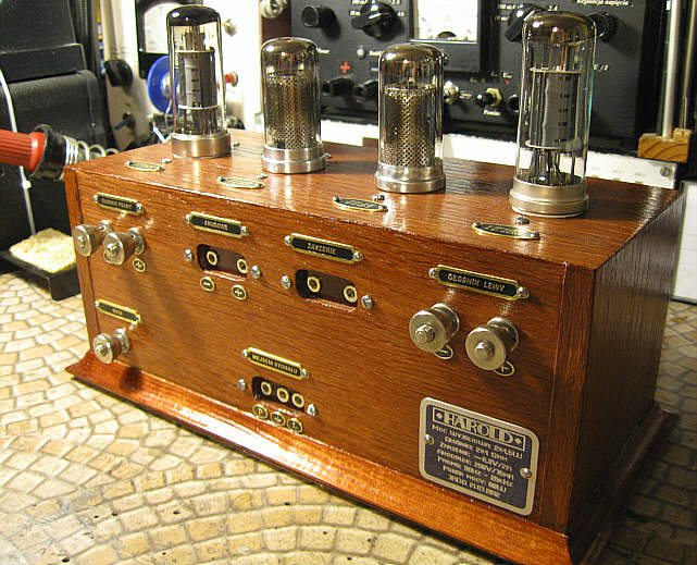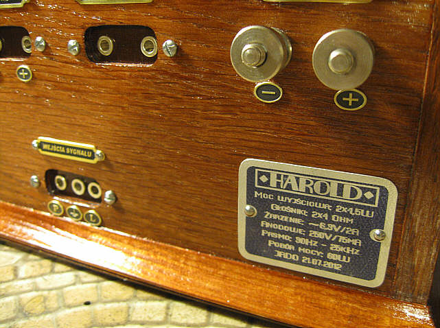 Oprócz tego wykonałem jeszcze tabliczkę znamionową z parametrami urządzenia oraz emblemat z nazwą wzmacniacza, który miał być umieszczony na przedniej listwie. Niełatwo było znaleźć odpowiednią nazwę dla wzmacniacza, bo większość charakterystycznych nazw jest już zajęta. W końcu wpadłem na szczęśliwy pomysł, że użyję imienia Harold, które kojarzy mi się z aktorem Haroldem Lloydem, komikiem występującym w niemych filmach z okresu lat 20-tych. W sam raz jeśli chodzi o epokę. Tym razem wykorzystałem aluminium oraz srebro jako materiały wyjściowe do wykonania emblematów.