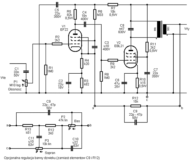 Po przejrzeniu książek (Meluzin) oraz przeszukaniu Internetu (Trioda, Elektroda, itp.) pod kątem schematów wzmacniaczy na lampach EF22 i EBL21, najbardziej przypadł mi do gustu schemat zaproponowany przez kolegę Studi’ego: