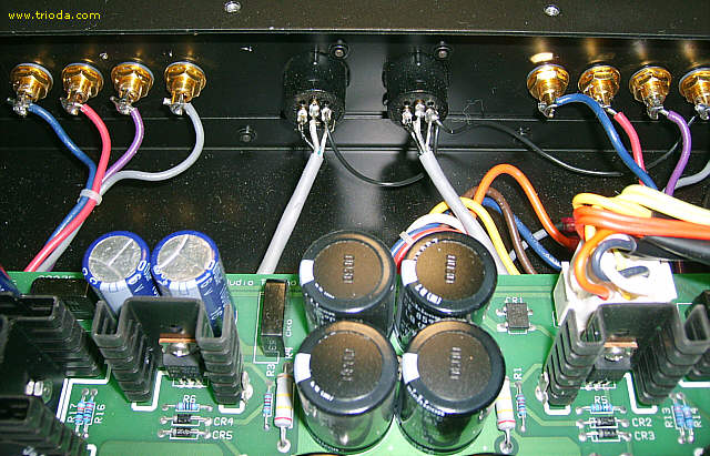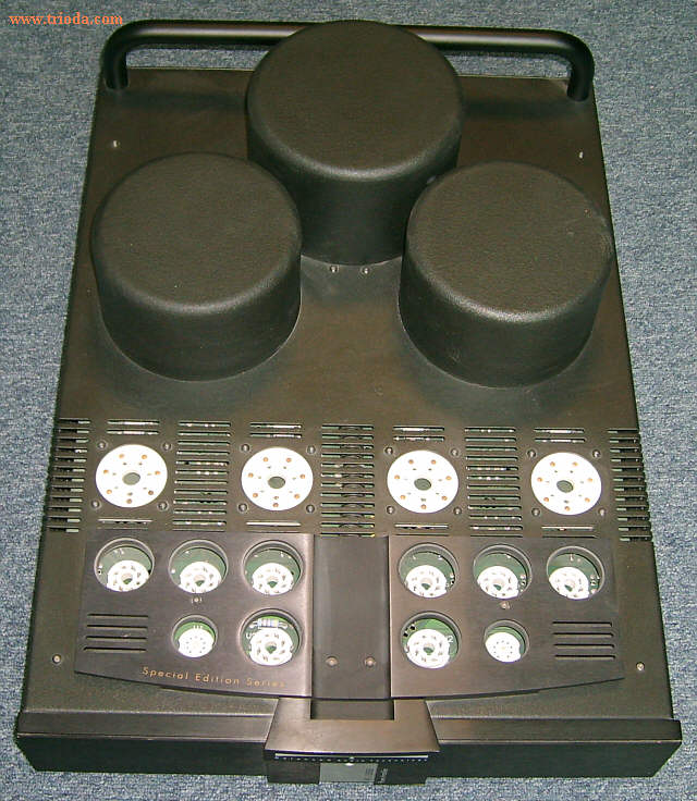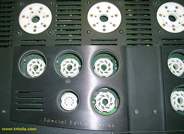 Na poniższej fotografii widać wyraźnie, jak dobrze "spasowana" jest obudowa i jak dobrze dopasowano otwory w chassis do położenia podstawek zamontowanych na płycie drukowanej umieszczonej wewnątrz obudowy. Środki otworów i środki podstawek znajdują się dokładnie na jednej osi. Żadnych dających się zauważyć przesunięć. Lampy wstawione do podstawek są umieszczone idealnie centrycznie w otworach. Polecam sprawdzenie tego drobiazgu w posiadanych wzmacniaczach - zapewniam, że nie zawsze jest tak pięknie jak tu