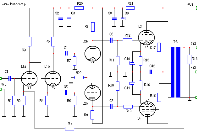 Poszperałem nieco w literaturze i na jej podstawie narysowałem (a dokładniej rzecz ujmując po prostu przerysowałem) schemat ideowy wzmacniacza, który przedstawiam na rys.1.