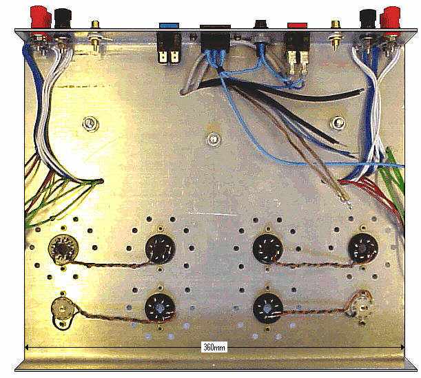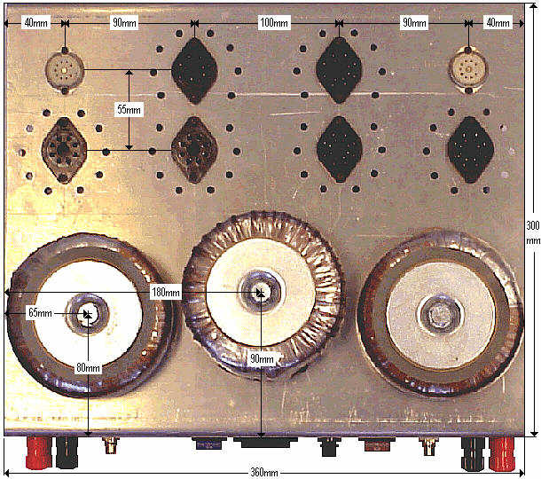 Na prostej podstawie w kształcie litery U zamocowałem podstawowe elementy składowe wzmacniacza. Podstawa wzmacniacza ma wymiary 360mmx300mm. Zdjęcia chassis w trzech ujęciach pokazano poniżej.