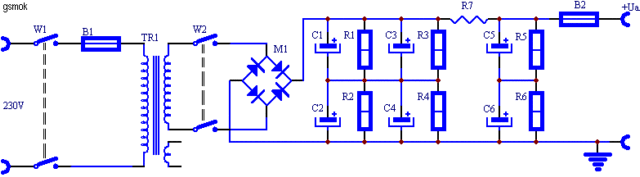 Ponieważ napięcia biegu jałowego posiadanego przeze mnie transformatora sieciowego niepokojąca przekraczają wartości przewidziane dla wzmacniacza w stosunku do pierwotnego projektu, który przewidywał sześć kondensatorów elektrolitycznych połączonych szeregowo-równolegle wprowadziłem małą modyfikację polegającą na wstawieniu rezystora R7, który postanowiłem w razie potrzeby wykorzystać do zbicia nadmiernego napięcia z transformatora. Podobny problem będę miał prawdopodobnie z napięciem żarzenia. W odróżnieniu od uzwojenia anodowego przewiduję w razie potrzeby odwiniecie odpowiedniej liczby zwojów. Aby nie przejmować się na razie wartościami tych napięć wzmacniacz będę uruchamiał zasilając go poprzez autotransformator. Kryterium doboru napięcia zasilającego będzie utrzymanie właściwej wartości napięcia żarzenia.