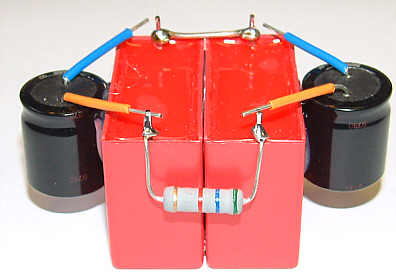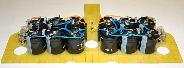 Po poprowadzeniu przewodów żarzenia wkleiłem moduł zawierający kondensatory filtrów stopnia napięciowego i odwracacza fazy.
