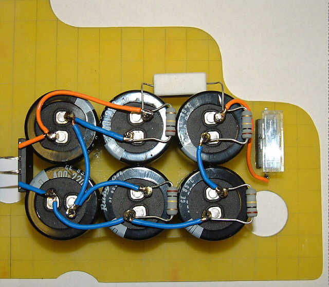 Okazało się, że posiadane kondensatory elektrolityczne są niewiele niższe od wysokości chassis. Aby uniknąć ewentualnych problemów związanych z odizolowaniem elementów pracujących pod wysokim napięciem od chassis (względy bezpieczeństwa przede wszystkim!!!) postanowiłem elementy umieścić na płytce z laminatu szklano-epoksydowego a następnie płytkę laminatu wkleić do chassis od spodu.