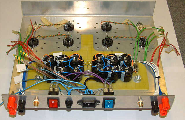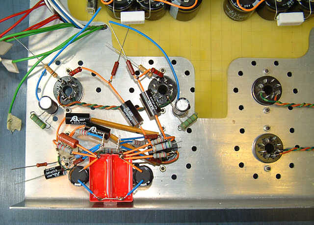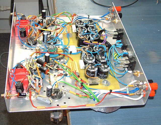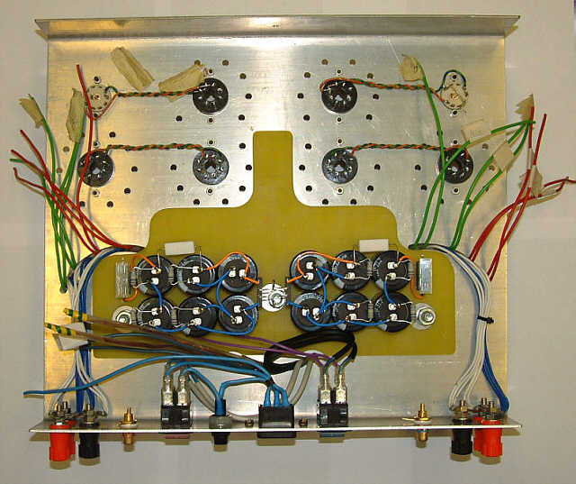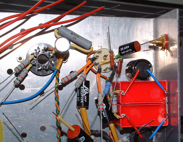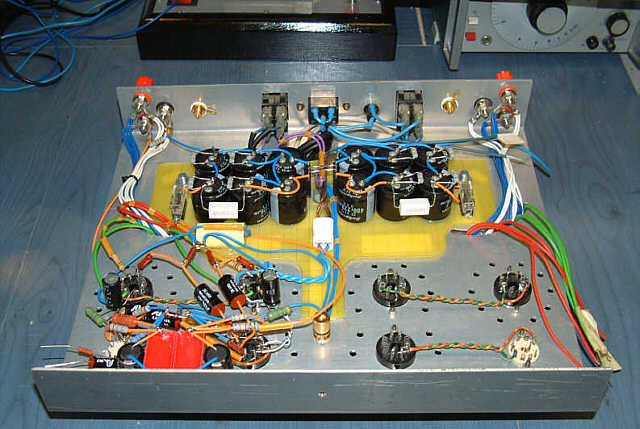 Biorę się teraz za montowanie drugiego kanału wzmacniacza. Zważywszy, że będę się wzorował na już uruchomionym kanale nie powinienem popełnić błędów. W kolejnym kroku dodam szczegółowe zdjęcia i skrótowy opis tych czynności. zastanawiam się również, czy nie przenieść gniazd wejściowych wzmacniacza z tylnej na przednią ściankę. Mógłbym wówczas połączyć kondensatory wejściowe bezpośrednio do tych gniazdek i skróciłbym w ten sposób drogę, jaką musi przebyć sygnał od gniazda wejściowego na siatkę pierwszej lampy.