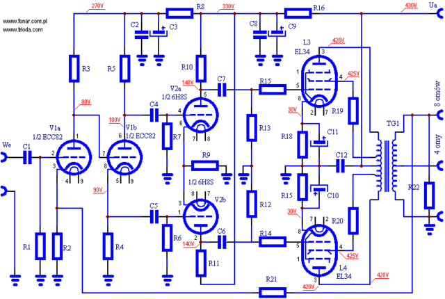 Rys.11. Schemat ideowy wzmacniacza (jeden kanał) z naniesionymi numerami nóżek podstawek lampowych oraz najważniejszymi napięciami ustalającymi punkty spoczynkowe pracy lamp