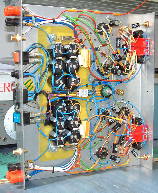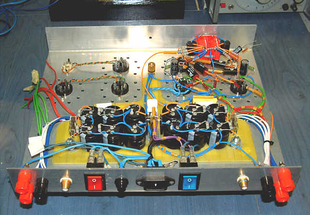 Tak wygląda całkowicie zmontowany zasilacz anodowy. Ceramiczna kostka widoczna z prawej strony posłużyła do przymocowania grubych przewodów żarzenia.