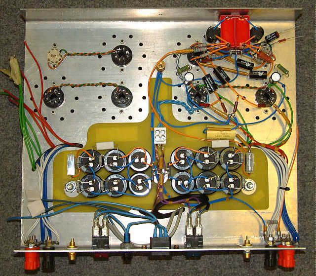 A tutaj mały "powrót do przeszłości". Podczas montowania elementów stopnia końcowego okazało się, że zasilacz anodowy troszkę i przeszkadza. I tutaj przydała się zastosowana konstrukcja wykorzystująca podstawę z elementami zasilacza. Szybkim ruchem wyjąłem cały zasilacz anodowy aby zmontować elementy na podstawkach lamp końcowych.