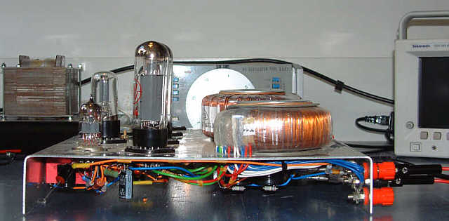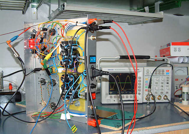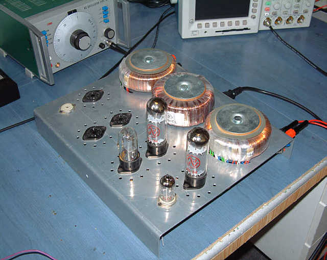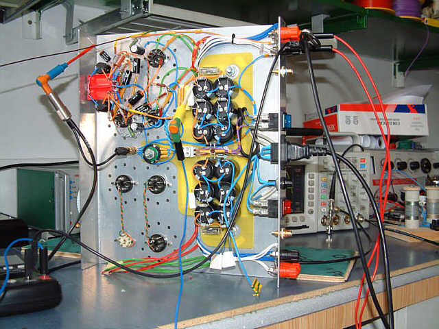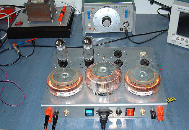 W pierwszym kroku wyjąłem wszystkie lampy, odłączyłem sprzężenie zwrotne (rezystor R21 według drugiego schematu), podłączyłem obciążenie zastępcze i włączyłem napięcia zasilające obserwując, czy nie dzieje się nic niepokojącego, czyli czy nie ma zwarć, "przeskakujących iskier", dymu unoszącego się nad grzejącym się elementem itd. Okazało się, że wszystko jest w porządku. Wyłączyłem wzmacniacz i poczekałem, aż rozładują się kondensatory w zasilaczu anodowym. Nie trzeba na to czekać zbyt długo z uwagi na fakt, że kondensatory zbocznikowane są rezystorami, przez które rozładowują się po wyłączeniu napięcia zasilającego wzmacniacz.