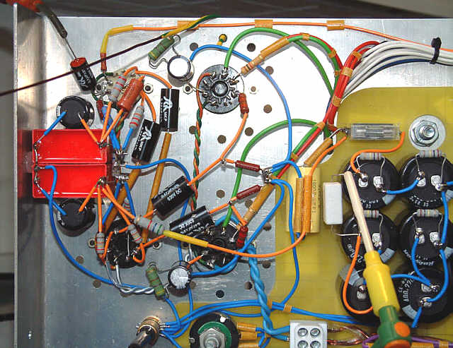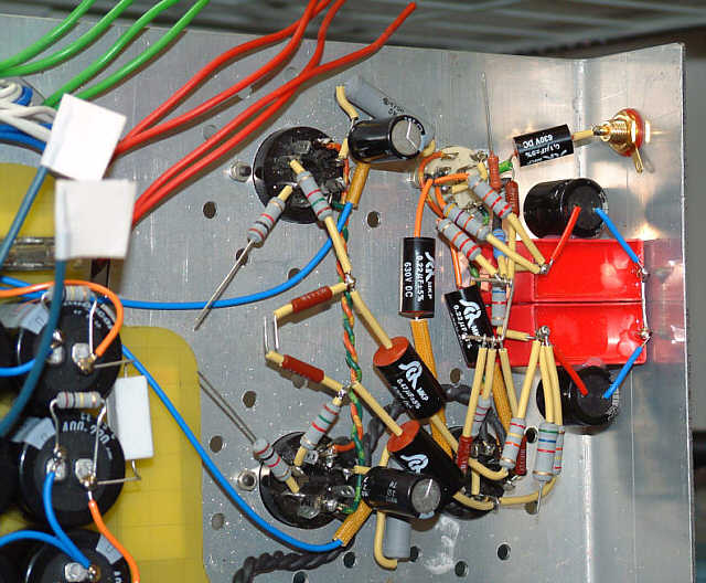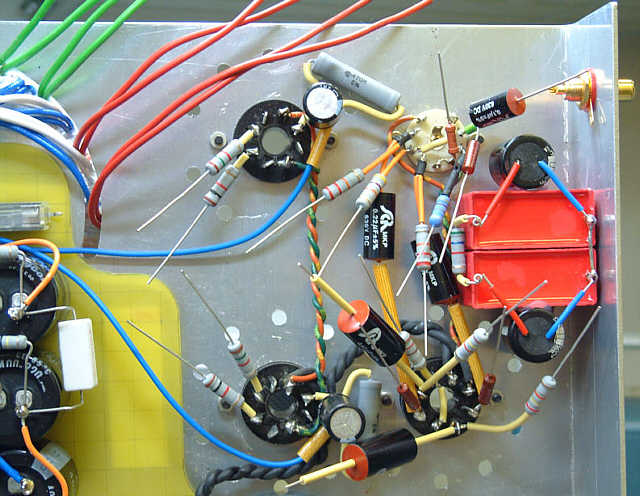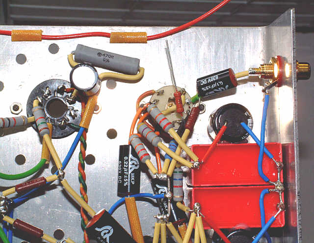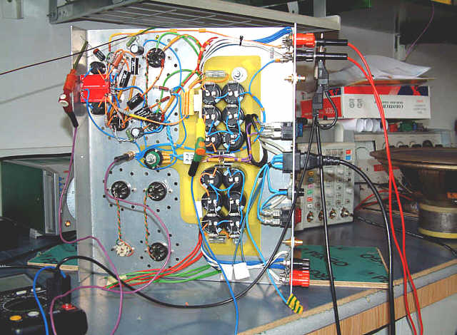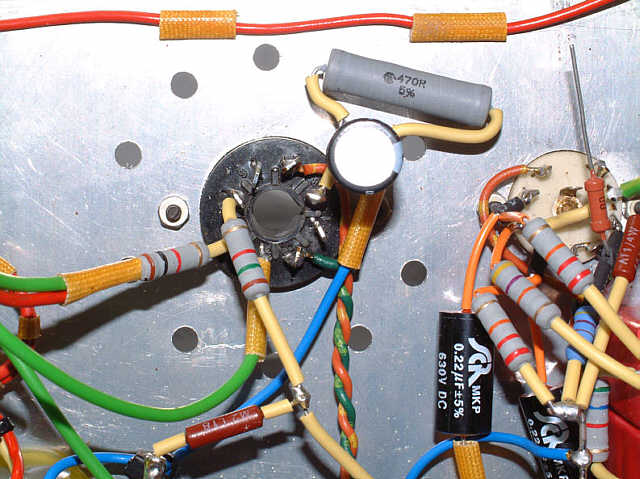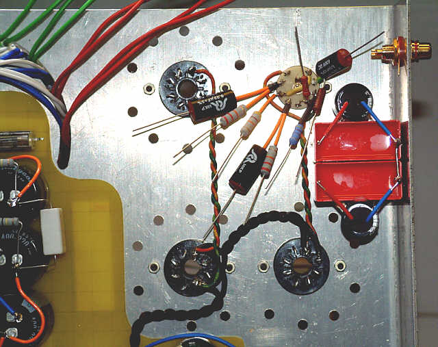 Tutaj widać wszystkie elementy jednego kanału wzmacniacza. Jedynym niepodłączonym elementem jest kondensator wejściowy - sygnał podawany jest na wejście nie przez gniazdo wejściowe lecz za pomocą "szczypawki" (tej brązowej) podpiętej na nóżce kondensatora wejściowego. Druga "szczypawka" (zielono-żółta) służyła do pomiaru napięcia anodowego.