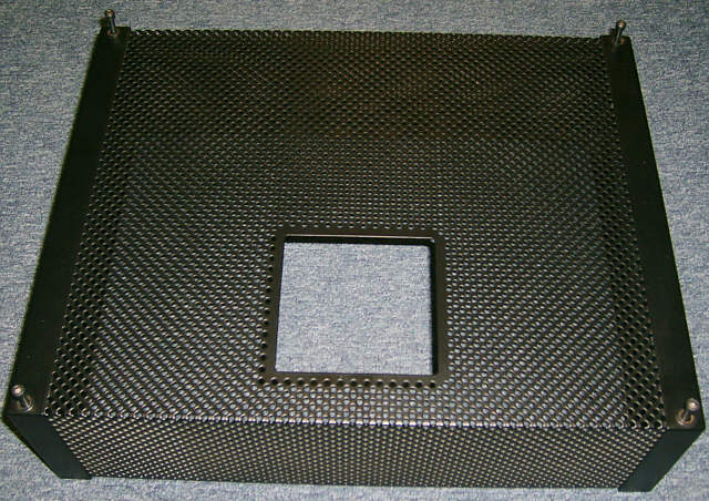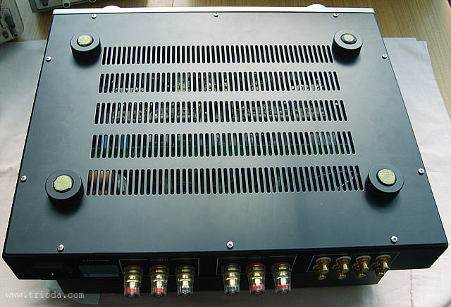 Wystarczy tych żartów. Skoro lampy zostały wyjęte, można wzmacniacz odwrócić bez obawy ich uszkodzenia. Oto widok od spodu. Solidna osłona z otworami wentylacyjnymi zapewniającymi odpowiednią cyrkulację powietrza. Wzmacniacz, nawet po kilkugodzinnej ciągłej pracy nie nagrzewa się zbytnio.