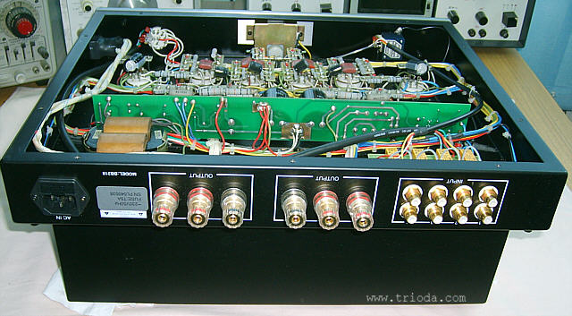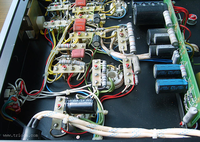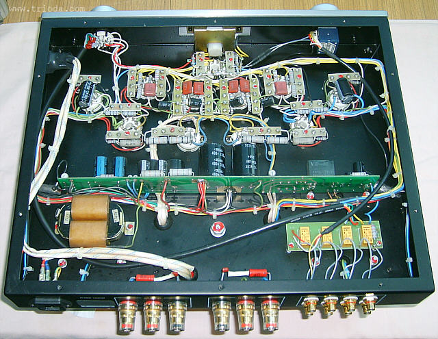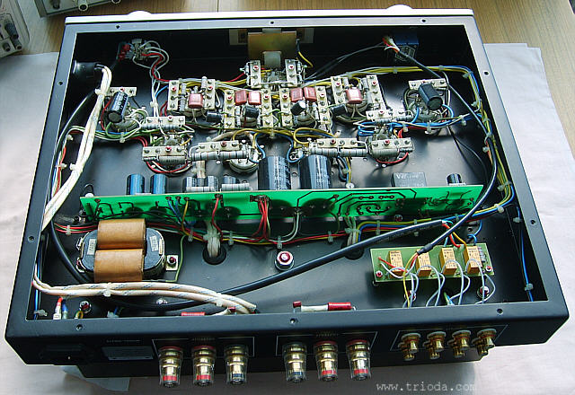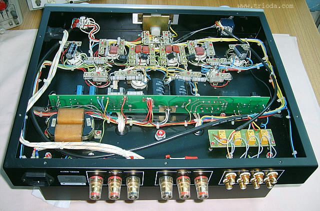 We wzmacniaczu zastosowano montaż mieszany. Zasilacz, oraz układ przełączania wejść zostały zmontowane na dwóch płytkach drukowanych. Układ wzmacniający został zmontowany techniką przestrzenną wspomaganą za pomocą listewek lutowniczych przykręconych bezpośrednio do chassis. Listewki tak dobrano, że wykorzystane zostały wszystkie punkty lutownicze - tam, gdzie potrzebne są trzy punkty, są listewki trzypunktowe, tam gdzie cztery - listewki czteropunktowe itd. Bardzo porządny montaż