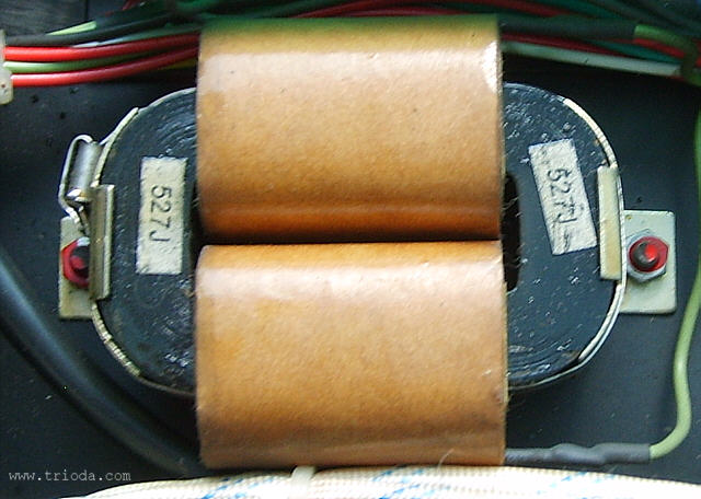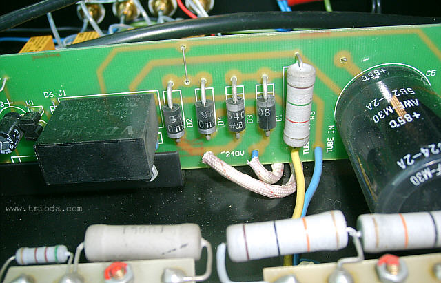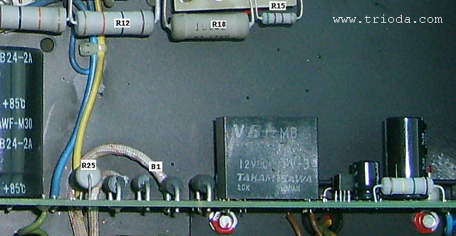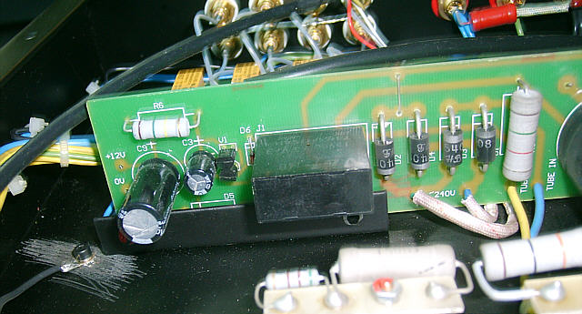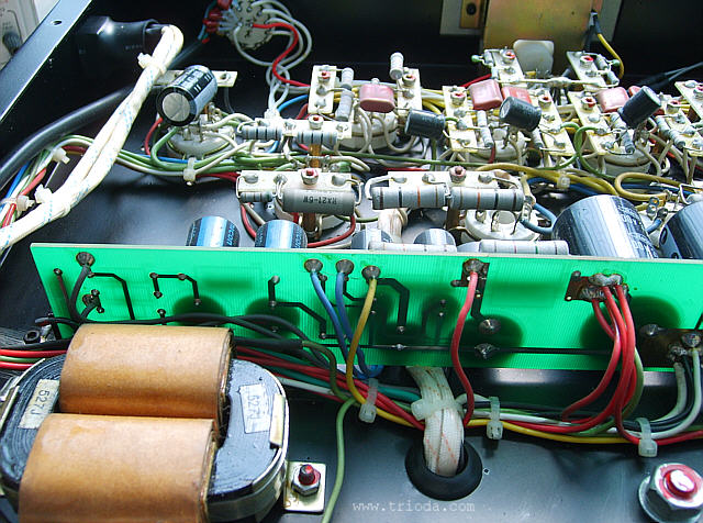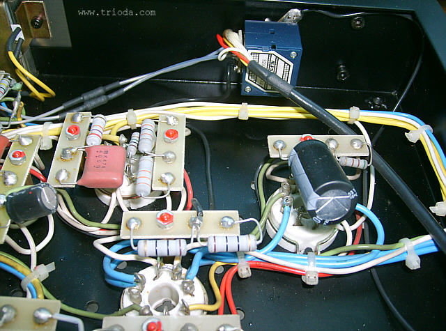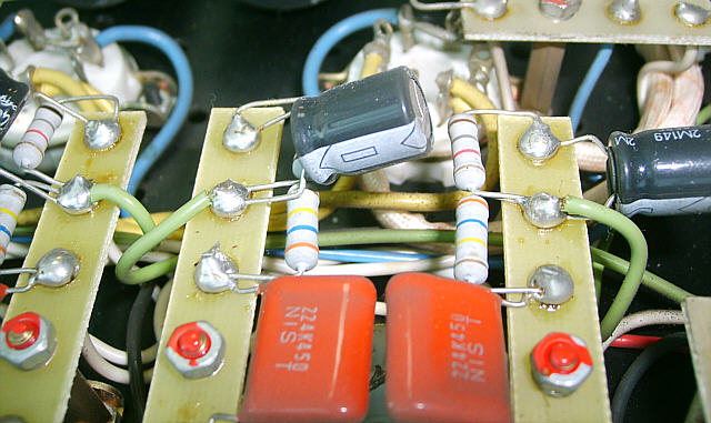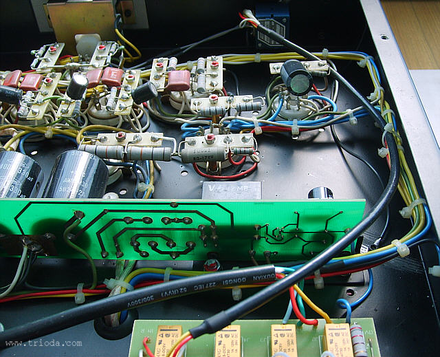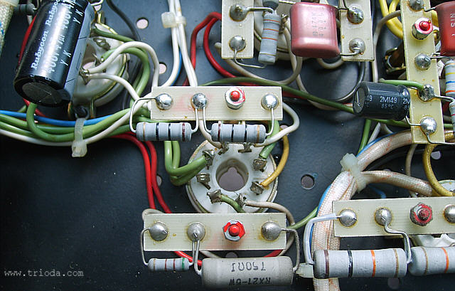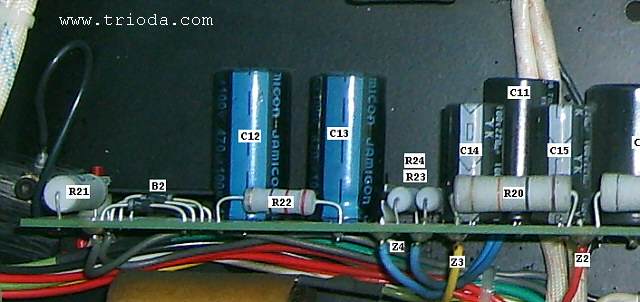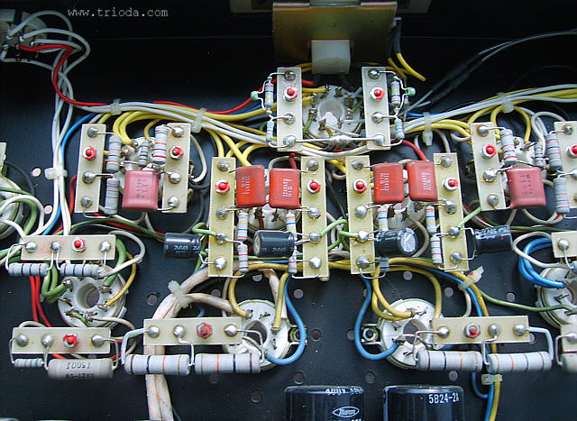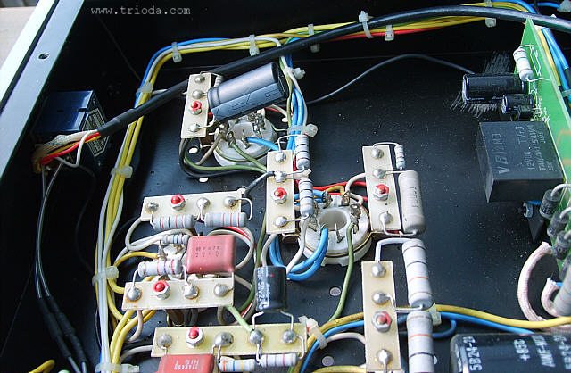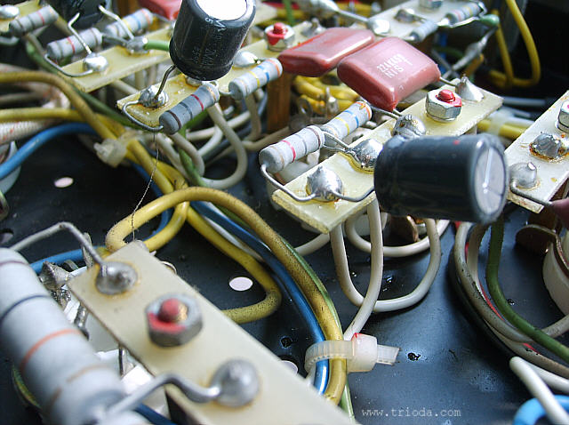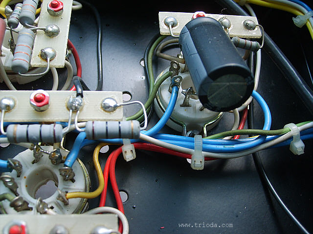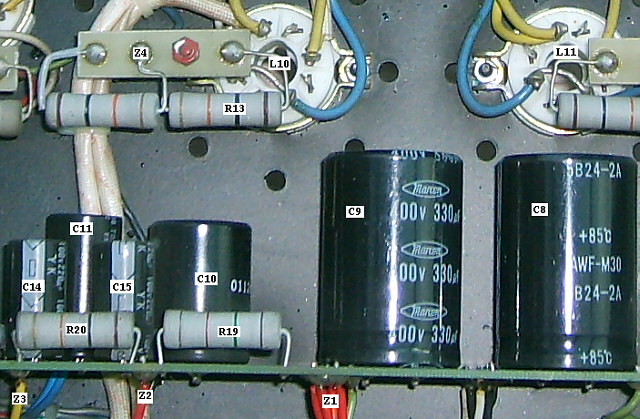 A tutaj mała ciekawostka montażowa. Rezystory, poprzez które dostarczane jest ujemne napięcie polaryzujące siatki lamp końcowych zmontowane są "na krzyż". Dla jednego kanału jest to rezystor R12 zamontowany w pobliżu lamp końcowych tego kanału, oraz rezystor R13 zamontowany na listwie montażowej umieszczonej w pobliżu przeciwstawnego kanału i na odwrót. Nie bardzo wiem dlaczego zastosowano taki montaż. Powoduje on, że w każdym kanale jeden z przewodów połączeniowych jest znacznie dłuższy od drugiego. To chyba jednak nie przypadek i coś się za tym kryje - ale co?