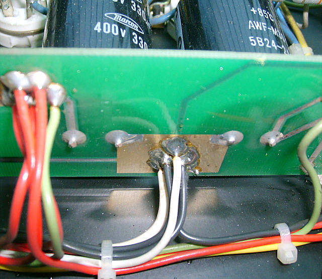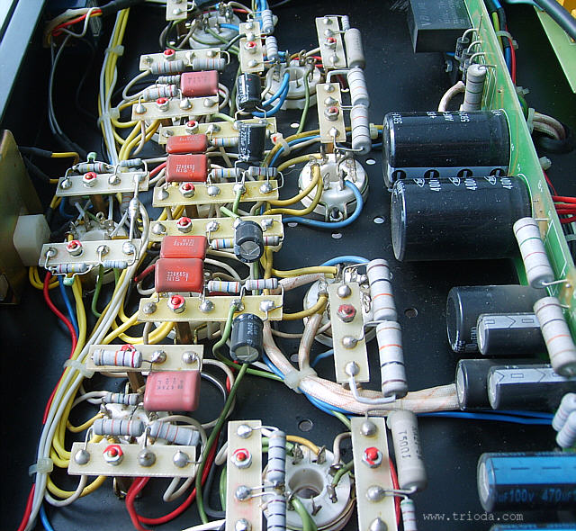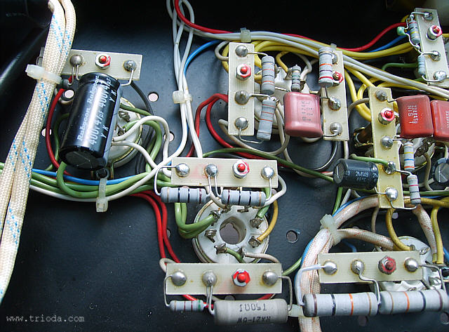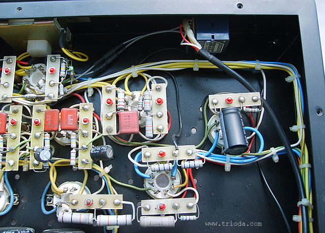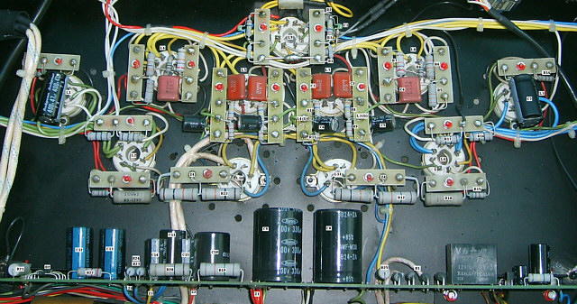 Solidny "placek" masowy i szereg czarnych i białych przewodów rozprowadzających masę po układzie wzmacniacza. Podobny "placek" z czerwonymi przewodami napięcia anodowego. Dla "zmyłki" jeden z czerwonych przewodów okazuje się być żółty.