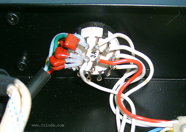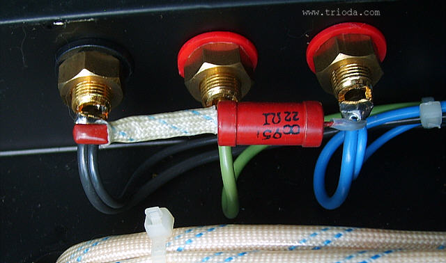 Zacznijmy od włącznika sieciowego. Jest on, jak widać zabezpieczony dodatkową elastyczną osłona, dzięki której miejsca podłączenia przewodów są całkowicie zasłonięte. Przewody umieszczone zostały w koszulkach olejowych - w sumie prawdziwy "szczyt" bezpiecznego montażu