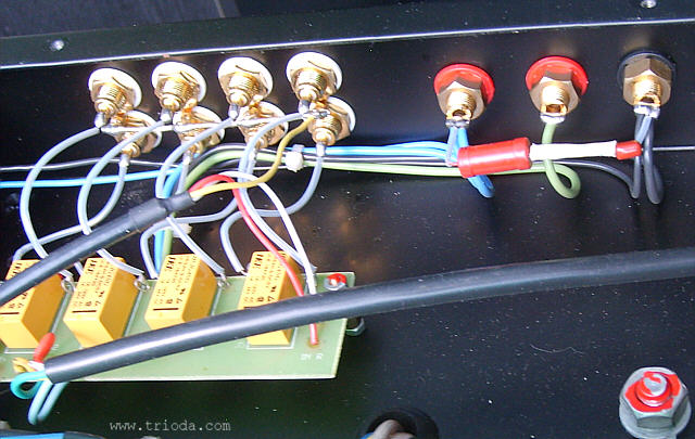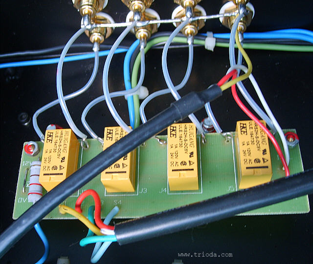 Gniazda wejściowe i zestaw przekaźników służących do zmiany aktywnego kanału wejściowego.