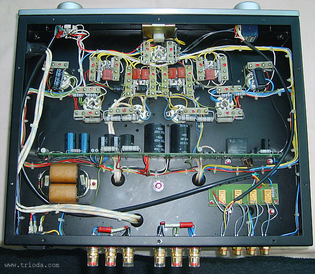 Czas na parę słów na temat szczegółów układowych. Na podstawie wstępnego porównania wnętrza opisywanego tutaj wzmacniacza z fotografią wnętrza jego młodszego brata umieszczoną w AudioVideo 6/2004 przyjąłem, że pomijając stopień końcowy, tor wzmacniający wzmacniacza z lampami końcowymi EL84 powinien być podobny do tego, który zastosowano we wzmacniaczu z lampami EL34. Kilka informacji udostępnionych przez konstruktora wzmacniacza redaktorom AudioVideo powinno być więc aktualnych również w przypadku niniejszej konstrukcji. Cóż to z informacje? Oto one (proszę pamiętać, że te dane dotyczą wersji z lampami EL84 a nie EL34):