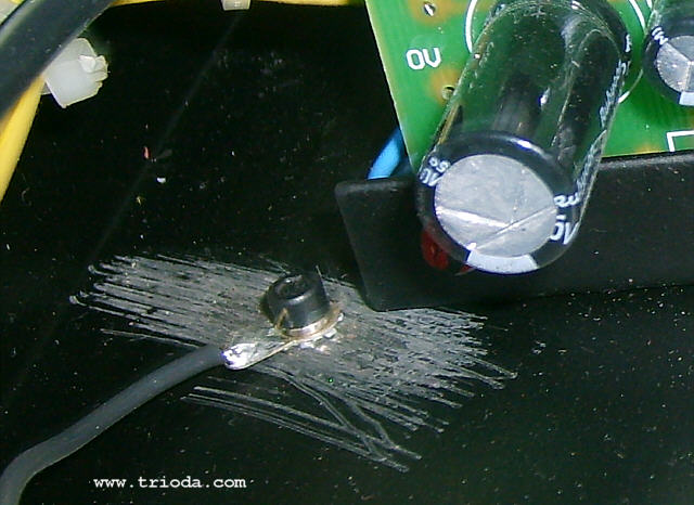 Na poniższej fotografii z prawej strony widoczny jest rezystor poprzez który masa zasilacza jest połączona z chassis. Sposób obróbki punktu przyłączeniowego na chassis jest żenujący