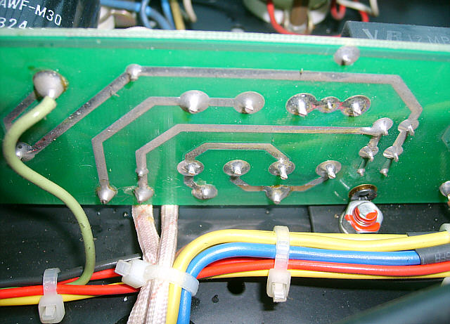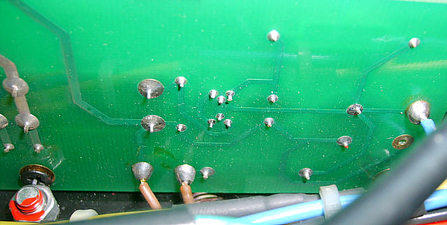 Jeszcze raz przekaźniki. Zastosowano tu pomysłowy montaż ułatwiający serwisowanie wzmacniacza. Przewody można bowiem lutować bez konieczności demontowania płytki drukowanej. W tym celu na płytce umieszczono pętelki lutownicze.