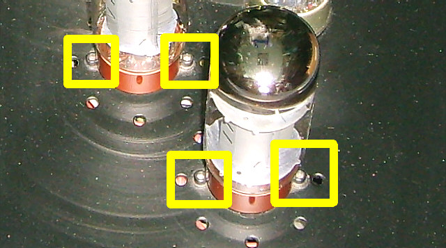 A oto widok wspomnianych "elementów regulacji biasu" (w żółtych obwódkach). Są nawet po dwa dla każdej lampy. A teraz na poważnie - nie chciałbym w żadnym wypadku wprowadzić kogoś w błąd. To są oczywiście śruby, którymi podstawki lamp są przykręcone do chassis, a wzmacniacz nie posiada elementów regulacji prądów spoczynkowych lamp końcowych.