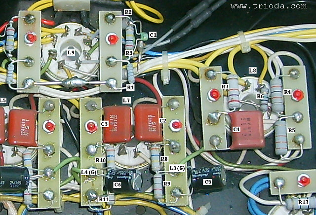 Na poniższej fotografii pokazany jest stopień napięciowy (lampa L9), inwerter fazy (lampa L8) oraz wtórnik sterujący lampami wyjściowymi (lampa L7). Oznaczone zostały oczywiście wyłącznie elementy jednego kanału. Sygnał wejściowy z suwaka potencjometru (niebieski Alps o rezystancji 100kΩ) podawany jest bezpośrednio na siatkę sterującą lampy L9. Lampa ta jest sprzężona bezpośrednio w inwerterem fazy. Sygnał z wyjść inwertera podawany jest z kolei poprzez kondensatory C2 i C3 na wejścia wtórników.