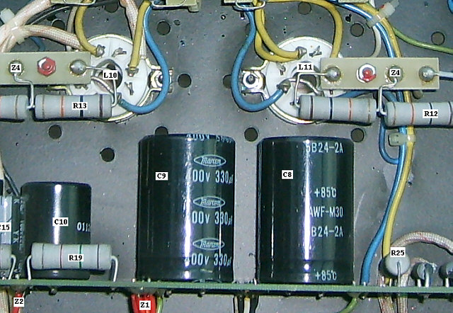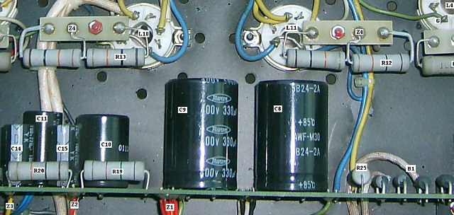 Teraz zasilacz. Widzimy tutaj (z prawej strony) układ opóźnionego załączania napięcia anodowego. Włączenie odbywa się w sposób łagodny. Zastosowano prostownik półprzewodnikowo-lampowy (mostek B1 oraz widoczne na poprzedniej fotografii lampy L10 i L11). Wyjście prostownika podawane jest na pierwszy kondensator filtrujący (C8) poprzez rezystor R25. W trakcie nagrzewania się lamp prostowniczych napięcie łagodnie narasta i jest cały czas obniżone przez spadek napięcia na szeregowo włączonym rezystorze R25. Po pewnym czasie włączany jest przekaźnik zwierający rezystor R25 i dopiero wówczas na kondensatorze C8 pojawia się pełne napięcie anodowe.