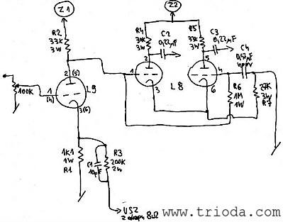 . Wystarczy spojrzeć na poniższą próbkę, która i tak wygląda najlepiej z wszystkich, które narysowałem. Pozostałe fragmenty wstyd pokazać przed spokojnym przerysowaniem na czysto. Przedstawiony fragment pokazuje napięciowy stopień wstępny (lampa L9) z doprowadzonym ujemnym sprzężeniem zwrotnym (z wyjścia 8Ω transformatora głośnikowego) oraz inwerter fazy (lampa L8).