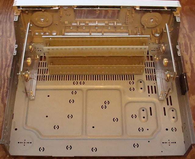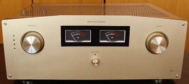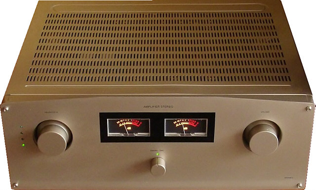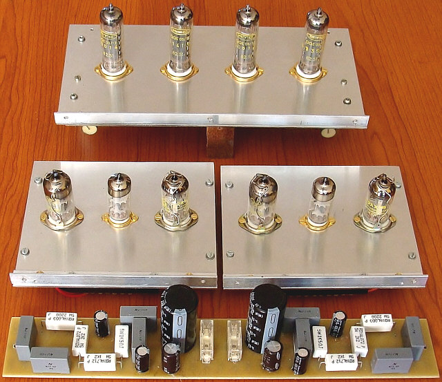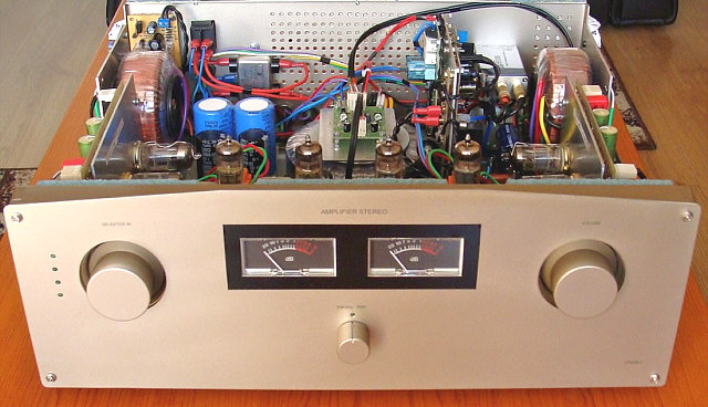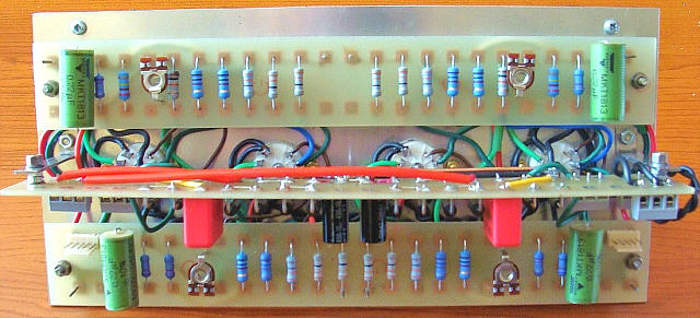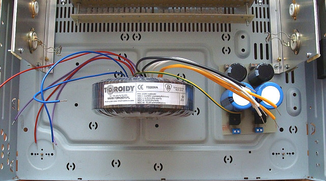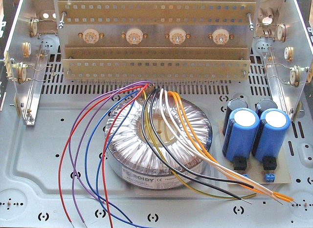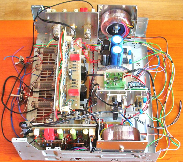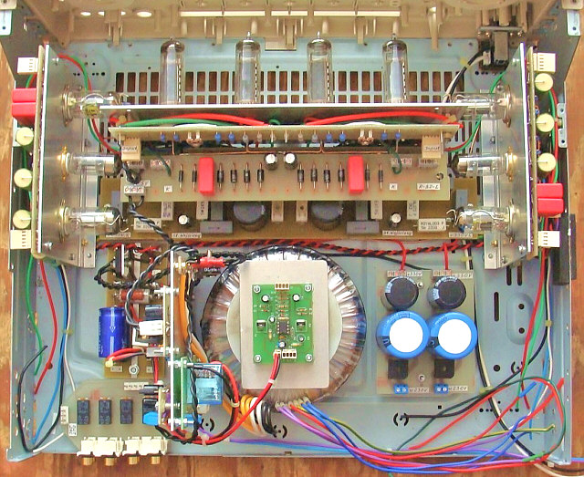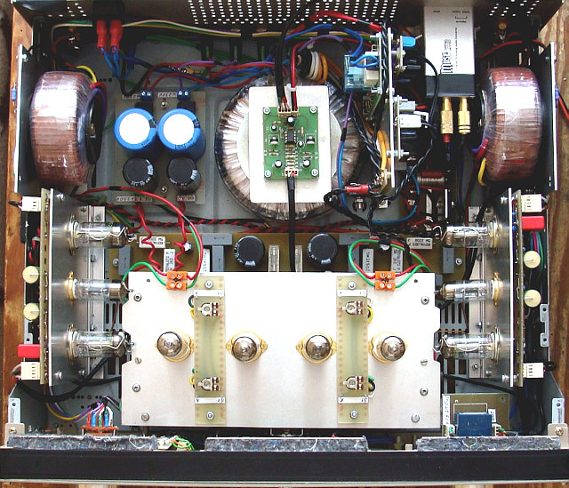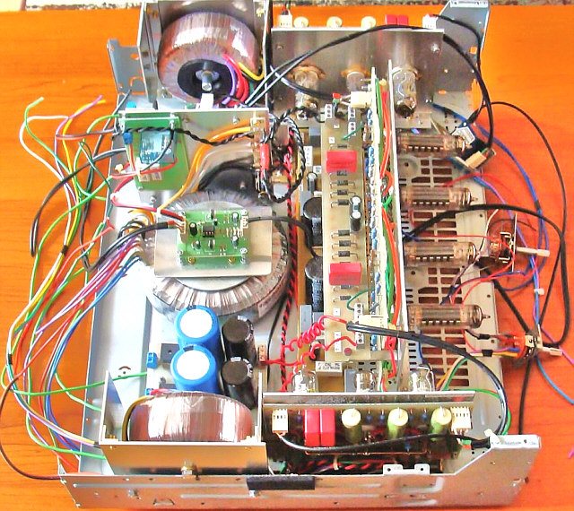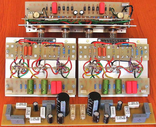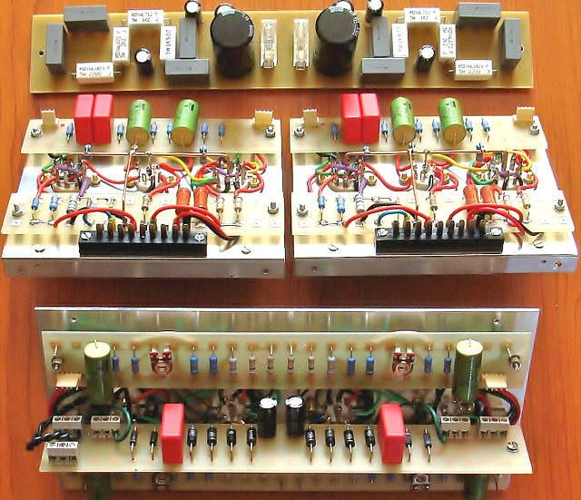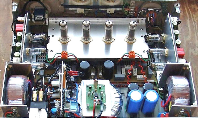 Na kolejnych fotografiach widać końcowy montaż wzmacniacza. Moduł stopnia mocy zamontowany jest centralnie. Moduły przedwzmacniaczy po bokach. Transformator sieciowy zlokalizowany jest w tylnej części. Obok transformatora zamontowana jest wspólna dla obu kanałów płytka zasilaczy z pojemnością filtrującą 2x1150μF.