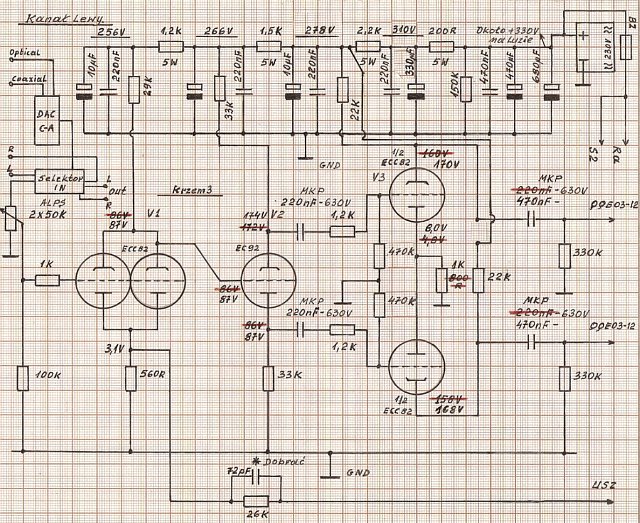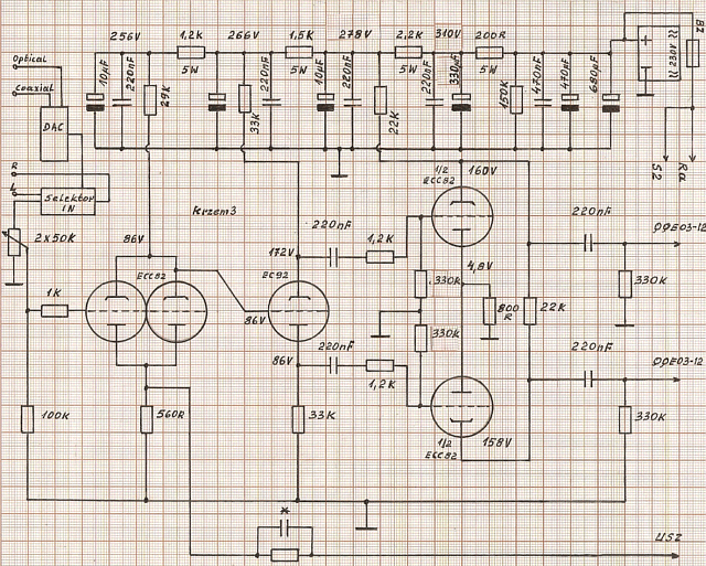 Zacznę od schematów ideowych. Poniżej przedstawiony jest pierwotny schemat układu wejściowego, inwertera fazy i stopnia wzmacniającego.