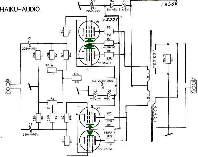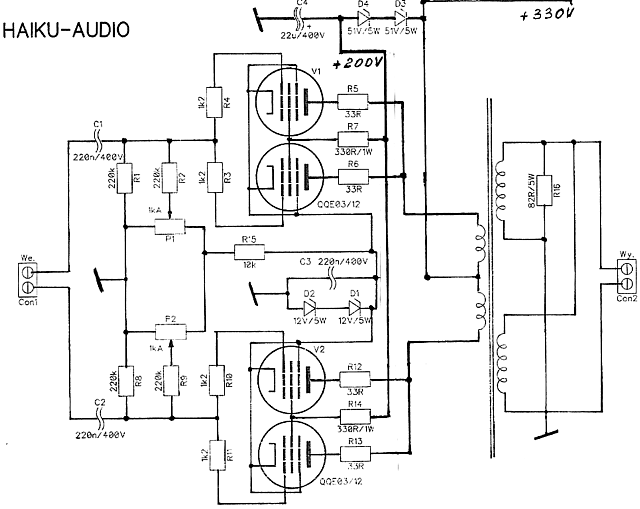 Za zgodą firmy HAIKU-AUDIO wykorzystałem układ stopnia wyjściowego z modyfikacją polegającą na usunięciu obwodu "Quad". Oto zastosowany stopień mocy w wersji pierwotnej...