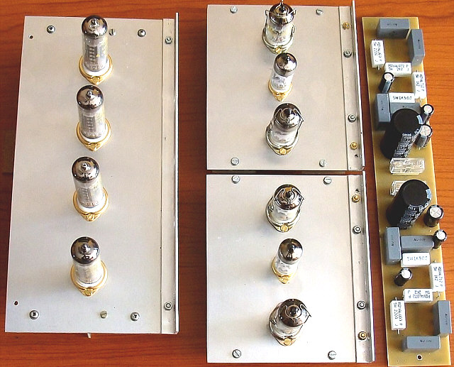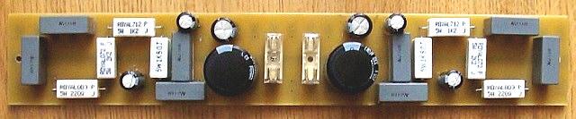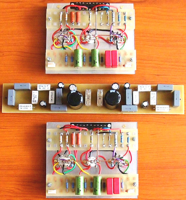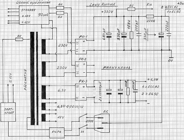 Po lewej stronie transformatora sieciowego (patrząc od tyłu) zamontowana jest płytka, na której po obydwu stronach umieszczone są układy wspomagające: soft start, układ opóźniający włączenie napięć anodowych o 90 sekund oraz zasilacz +12V.