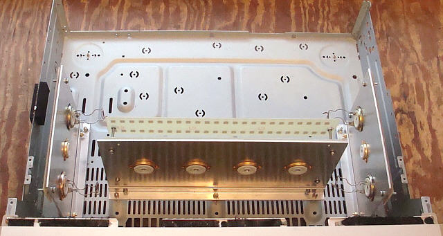 Całość przykryta jest perforowaną osłoną. Wykonana jest ona z dosyć cienkiej blachy. Nie ma to jednak większego znaczenia, gdyż wiadomo, że w uwagi na cyrkulację powietrza na wzmacniaczu nie powinno się nic stawiać.
