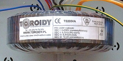 Teraz transformator sieciowy. Postawiłem go do zrobienia fotografii. Docelowo jest on przykręcony w pozycji "leżącej"...