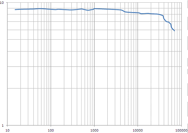 Górna częstotliwość graniczna przy spadku pasma o 3dB wynosi 69kHz dla mocy wyjściowej 10W.