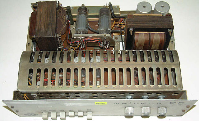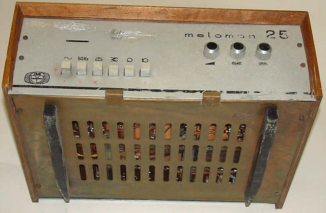 Nabyty przeze mnie egzemplarz wzmacniacza „Meloman 25” był niekompletny, to znaczy brakowało pokrywy górnej i jednej lampy PL500. Był dość mocno zanieczyszczony, toteż byłem zmuszony niektóre detale przetrzeć acetonem. Po przylutowaniu przewodu zasilającego i wstawieniu brakującej lampy podjąłem próbę uruchomienia tego cuda.