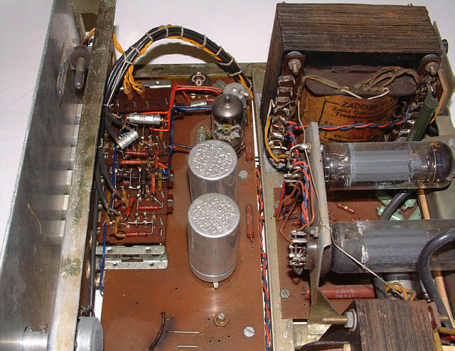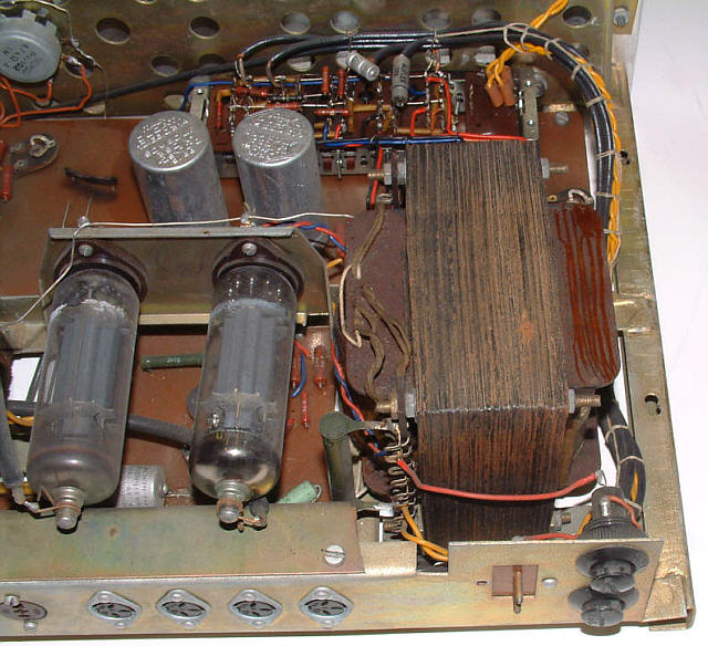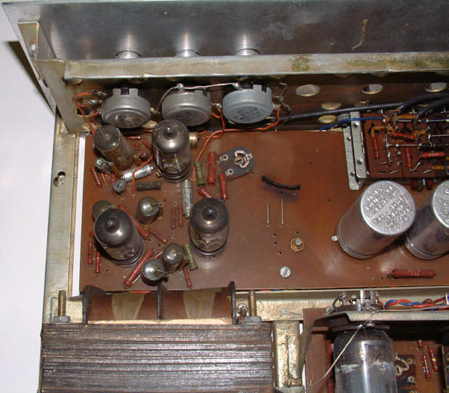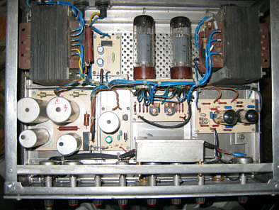 Wczoraj stałem się posiadaczem takiego wzmacniacza (dzięki użytkownikowi Forum Triody - brener2), z początku myślałem, że będzie z nim natłok roboty. Na początek przeczyszczenie wnętrza, gdzie kurz i pająki zrobiły swoje. Gdy to się udało, odpaliłem wzmacniacz. I co? Nie gra, chociaż lampy się żarzą. Sprawdzam to, co zazwyczaj jako pierwsze w takich sytuacjach się sprawdza - czyli bezpiecznik anodowy. Spalony... Podłączam zamiast tego bezpiecznika żarówkę 100W i przy włączaniu się rozbłyska na bardzo krótko i gaśnie - widocznie wcześniej musiał być włożony bezpiecznik szybki, a oczywistym jest, że potrzebny jest zwłoczny.
