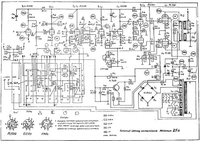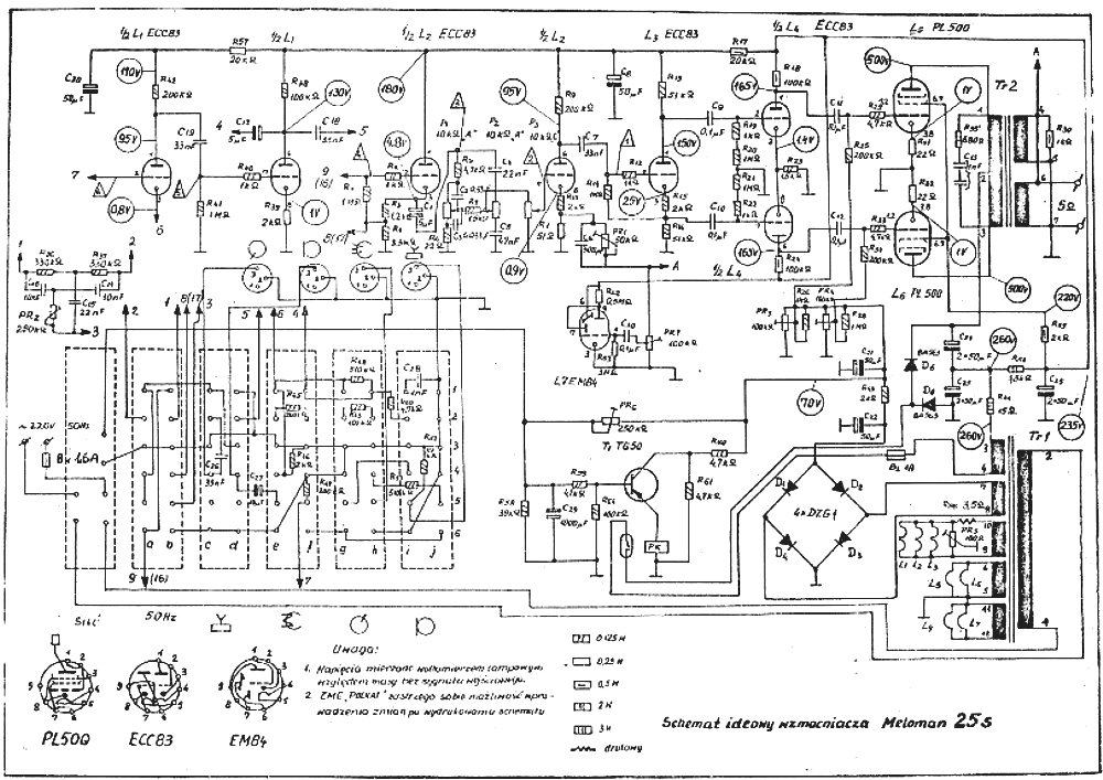 Dzięki użytkownikowi pionier62 z Forum TRIODA, który dodał fabryczny schemat Melomana 25 mogłem uzupełnić dokumentację o ten ważny element. Schemat można otworzyć w nowym okienku przeglądarki klikając na niego myszką.
