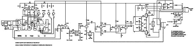 Przeciwsobna końcówka mocy z lampami V5 i V6 pracuje w tradycyjnym można rzec układzie. Należy dodać, że transformator ma chyba jednak sekcjonowane uzwojenia. Tak wynika z etykietki. Potencjometry 100k służą do ustawiania napięcia polaryzacji napięć siatek lamp V5 i V6. Napięcie dla tych siatek jest uzyskiwane z transformatora sieciowego a następnie prostowane w mostku Graetza z diodami DZG1. Napięcie wysokie dla lamp jest uzyskiwane z prostownika z diodami DK 61. Filtrowanie tego napięcia - za pomocą ogniw RC.