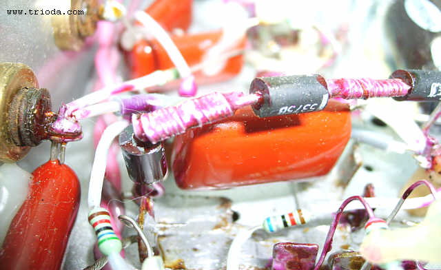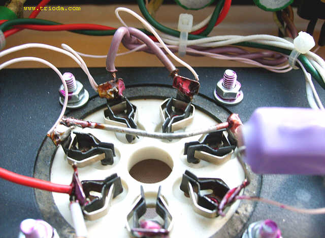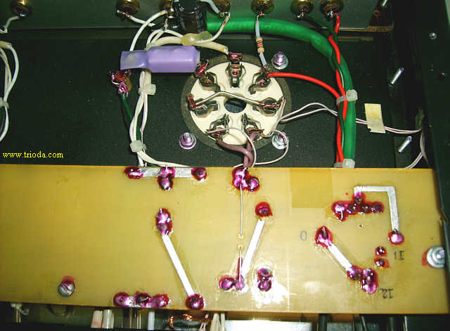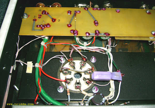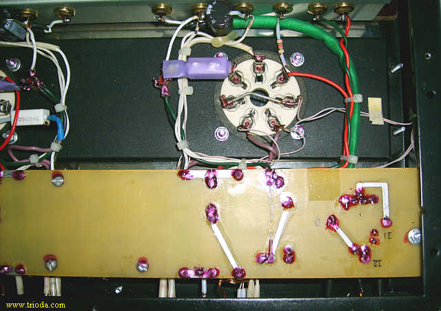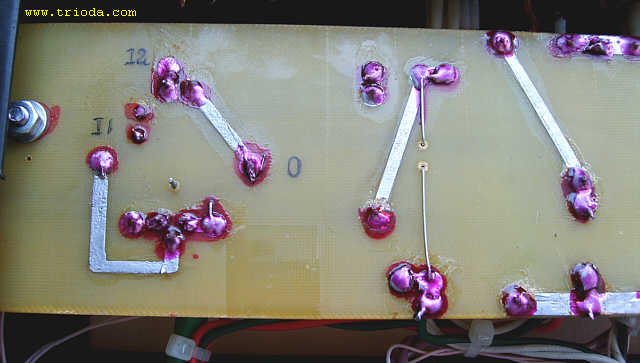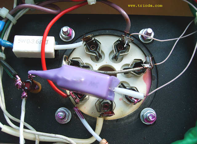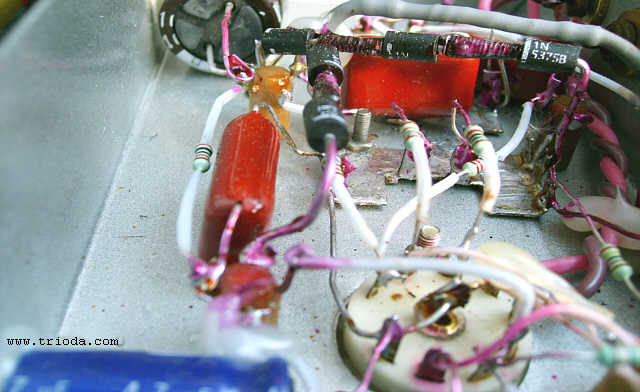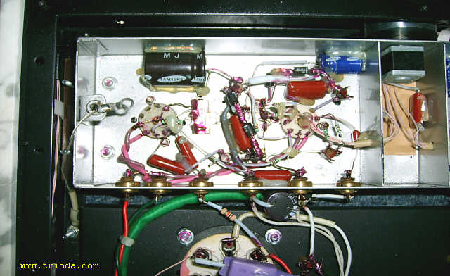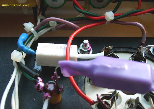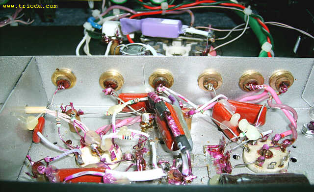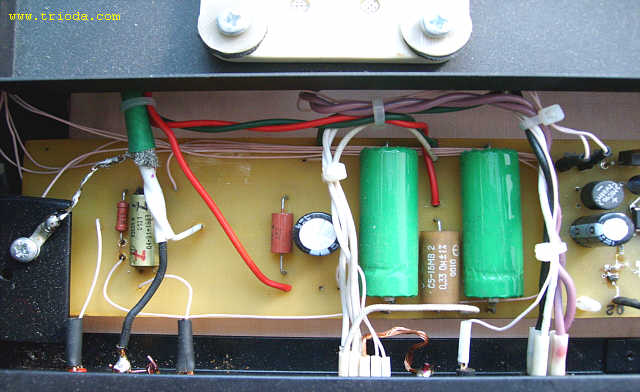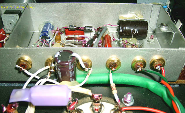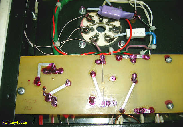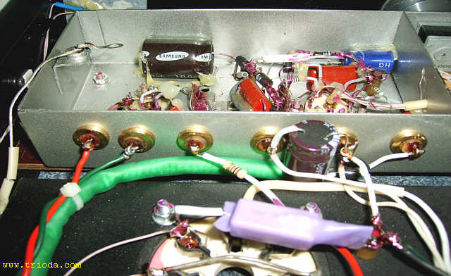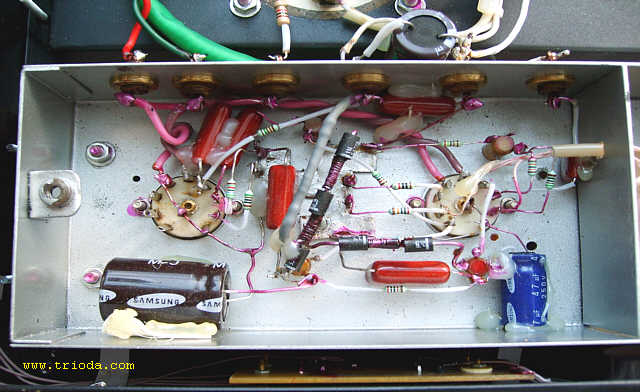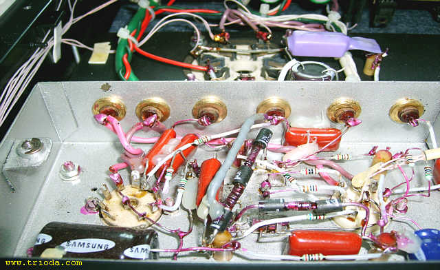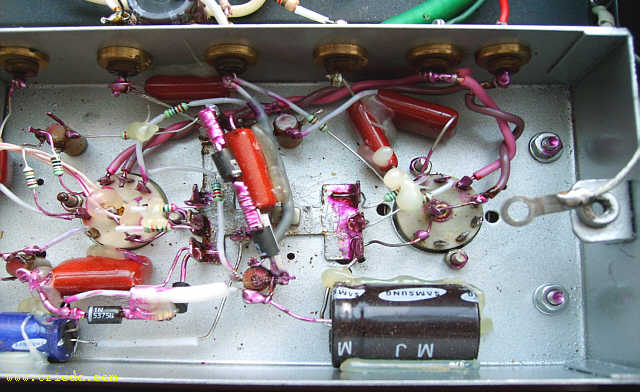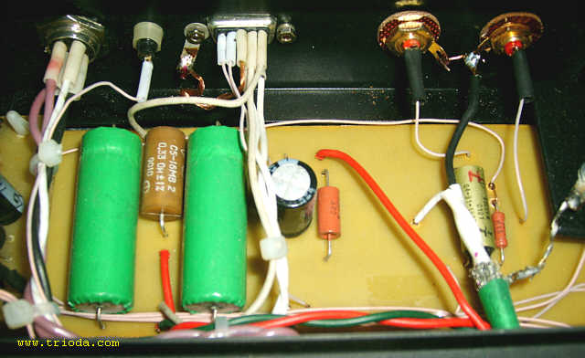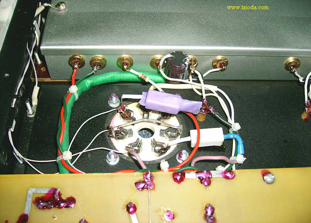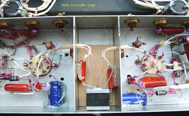 Czas na stopniową wiwisekcję wzmacniacza. Oto on na stole warsztatowym - widok od tyłu - jeszcze z kablami połączeniowymi...