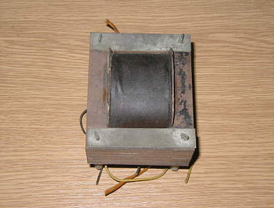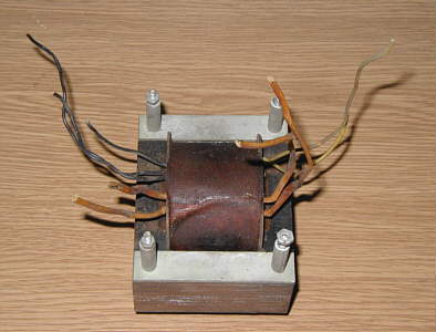 Pierwsze, co rzuciło mi się w oczy, to podłączenie przewodów do transformatora sieciowego. Drut nawojowy (na szczęście w bawełnie- nie było problemów z odizolowywaniem) uzwojenia anodowego urwany był przy samym karkasie, a uzwojenie pierwotne- przylutowane do przewodów i dopiero przez nie do łączówki. Oczywiście izolacja i zabezpieczenie mechaniczne bardzo dziadowskie... Wyjąłem więc trafo sieciowe i przylutowałem drut miedziany w izolacji do końców uzwojenia anodowego, prowadząc go później do łączówki (ułożył się ładnie :)). Poprawiłem parę połączeń, usunąłem niezliczone zimne luty i założyłem trafo z powrotem.