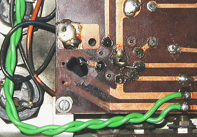 Łuk musiał być przepotężny - świadczą o tym nadpalone przewody (oranżowy i niebieski oraz okopcone chassis), poprzedni właściciel odciął uszkodzone odcinki ścieżek i przylutował przewody 6,3V dalej.