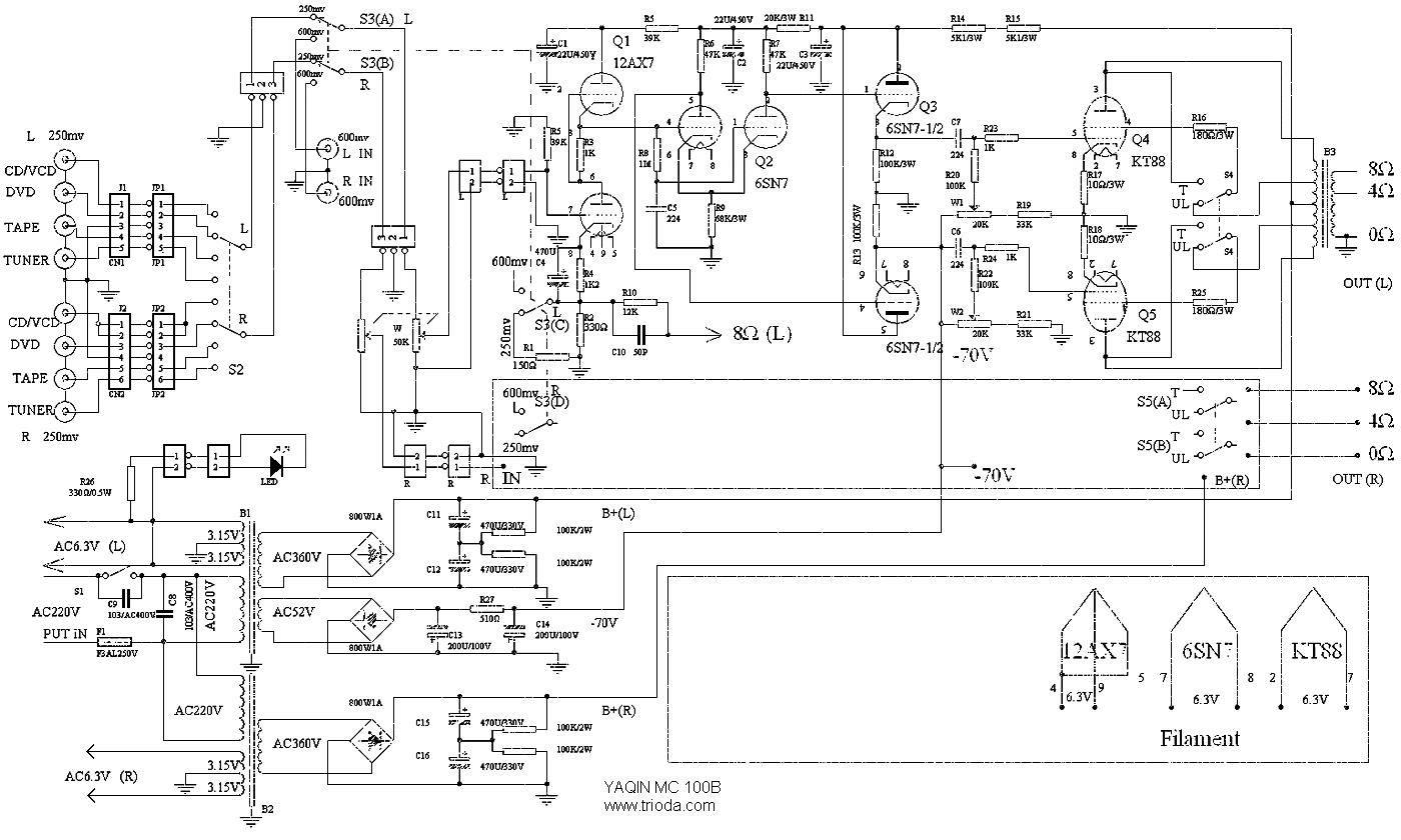 Zgodnie z deklaracją producenta zawartą w instrukcji obsługi wzmacniacz Yaqin MC-100B charakteryzuje się następującymi parametrami: