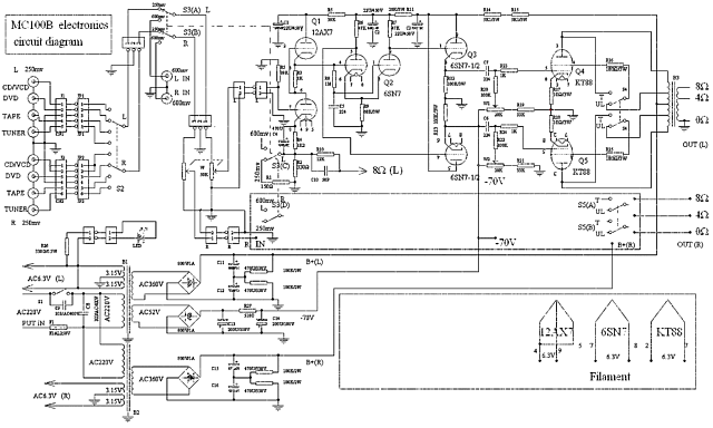 Przed zajrzeniem do wnętrza wzmacniacza warto spojrzeć na jego schemat ideowy. Wersję bardziej czytelną można uzyskać klikając myszką na Rys. 9. Warto skonfrontować elementy schematu ideowego z rzeczywistymi elementami uwidocznionymi na fotografiach.