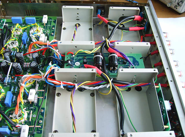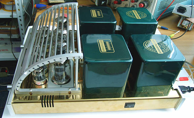 Widok ogólne wzmacniacza pokazany jest na Rys. 1. Cztery puszki chroniące transformatory sugerują, że jest to konstrukcja, w ramach której w jednej obudowie umieszczone są nie tylko dwa kanały wzmacniające, ale również dwa niezależne zasilacze