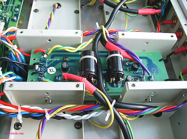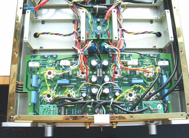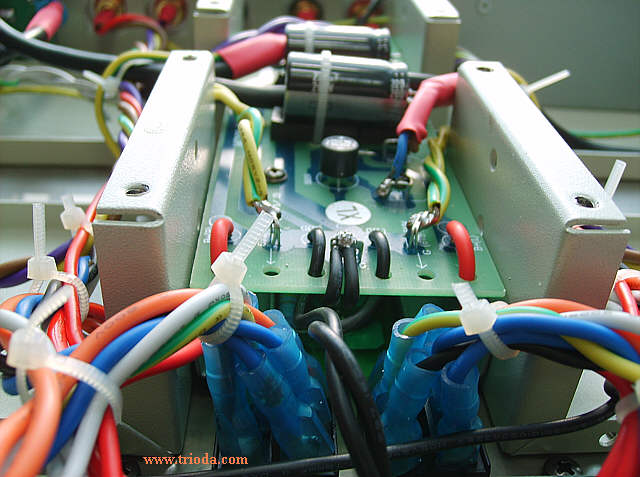 Na Rys. 6. pomiędzy transformatorami głośnikowymi widać dwa przełączniki. Przeznaczone są one do zmiany trybu pracy lamp końcowych z triodowego (TR) na ultralinearny (UL). Producent zaznacza, że przed zmianą trybu pracy wzmacniacz należy wyłączyć i oba kanały powinny pracować w tym samym trybie. Nasuwają mi się w tym momencie dwie uwagi krytyczne