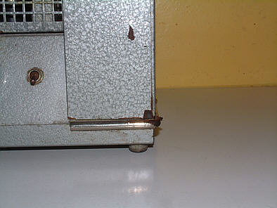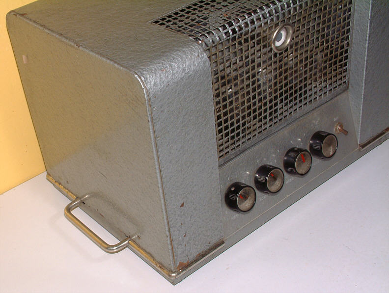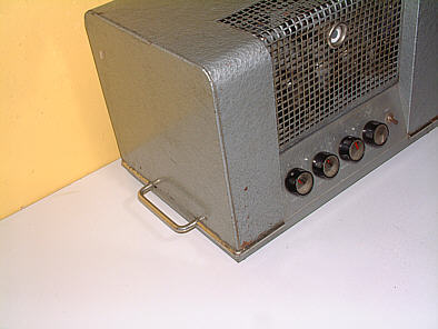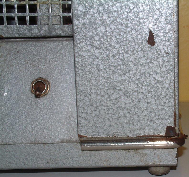 Obudowa wzmacniacza jest w niezłym stanie. Przede wszystkim nie jest powyginana ani powgniatana. Niestety wzięła się za nią korozja. Tu i uwdzie pojawiły się burchle i odpryski lakieru. Jest to szczególnie widoczne w miejscach ,w których zamocowane są elementy ozdobne. Widać to na fotografii.