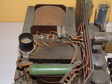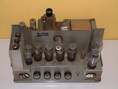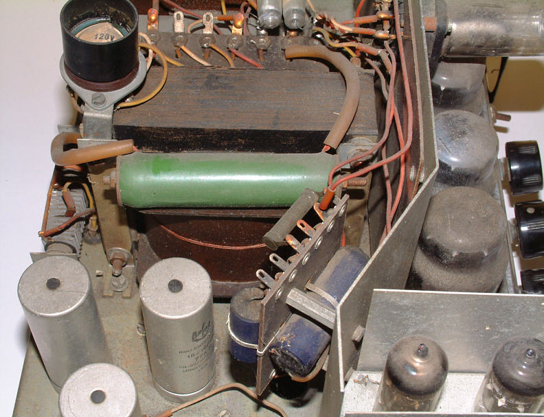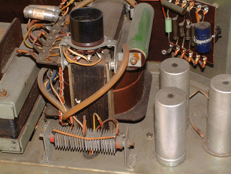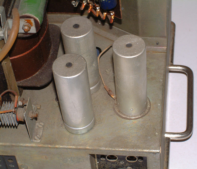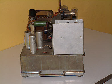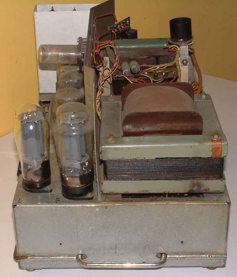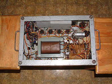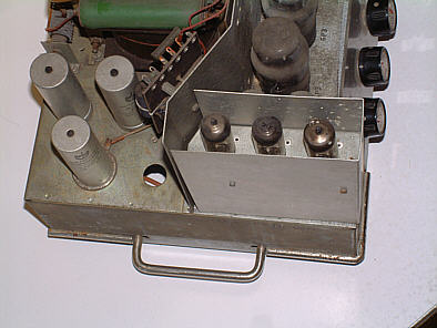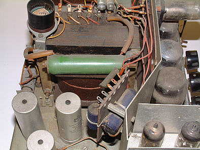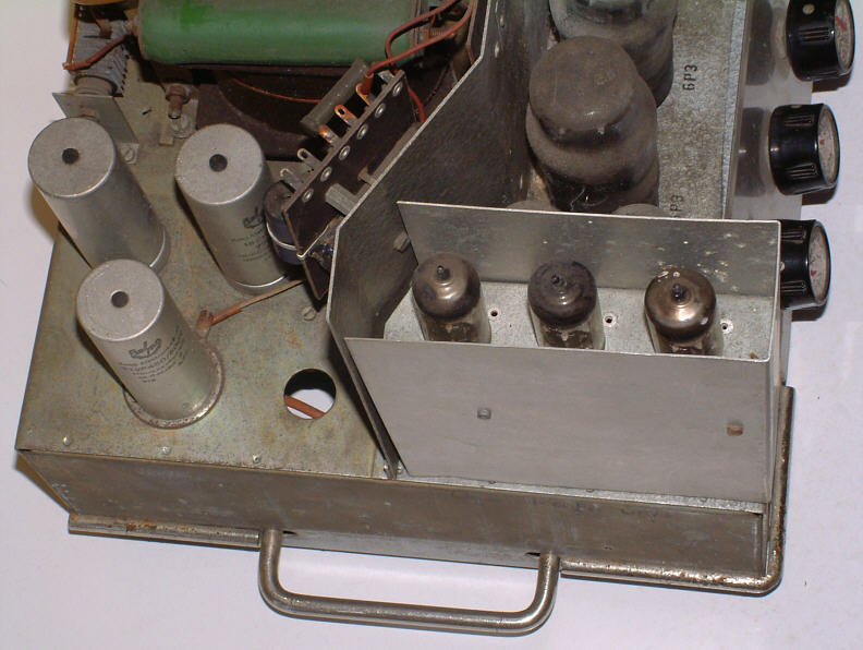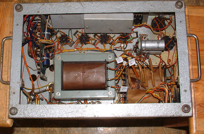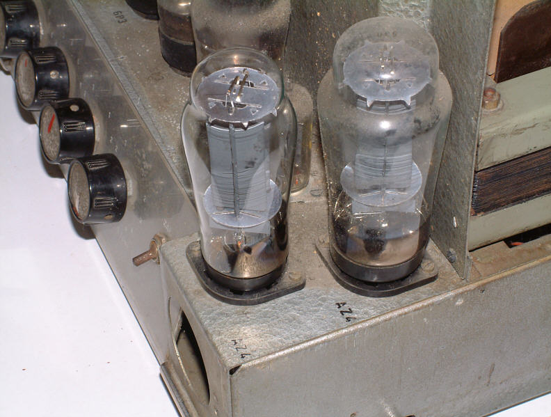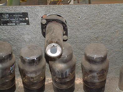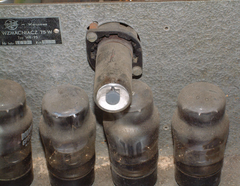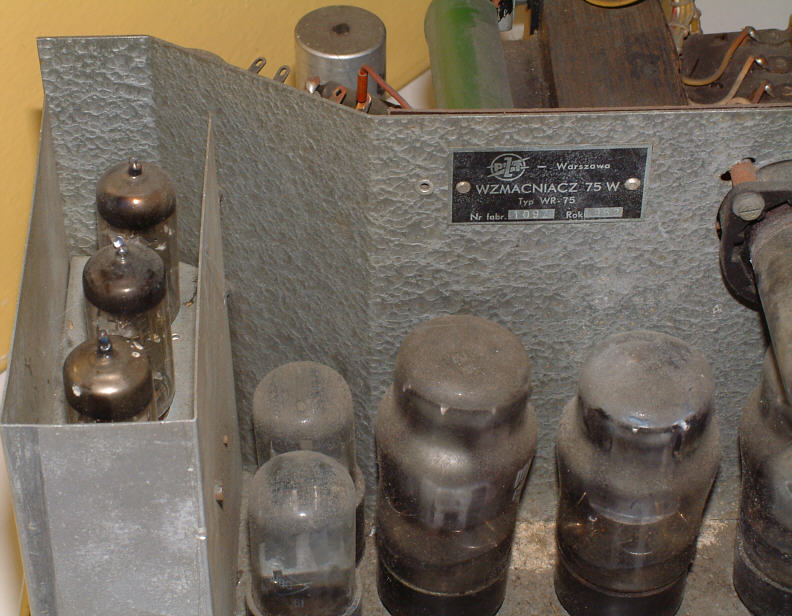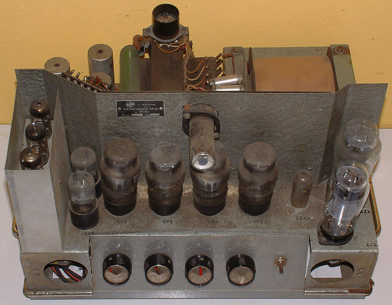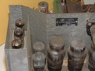 Dodatkowe ujęcie nieco z góry. Wzmacniacz jest cały zakurzony. Fotki zrobiłem w celu udokumentowania jego stanu pierwotnego (no dobra, przyznaję, że nie mogłem się powstrzymać i wypucowałem jedną z lamp prostowniczych, co zresztą widać na dalszych zdjęciach).