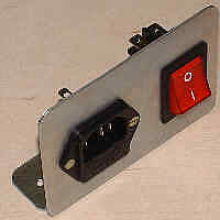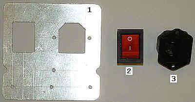 Gniazdo do podłączenia kabla sieciowego ze zintegrowanym bezpiecznikiem [3] i wyłącznik sieciowy [2] będą zamocowane na specjalnym aluminiowym wsporniku [1]. Zastosowałem tu blachę o grubości 1mm z odpowiednio wyciętymi otworami.