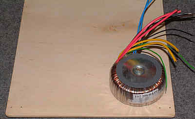 W zasilaczu zastosowałem transformator toroidalny, który po prostu przykręciłem za pomocą dużego wkrętu do drewna. Wykorzystałem tutaj standardowe (dostarczone razem z transformatorem) elementy mocujące w postaci gumowych podkładek i metalowych talerzyków dociskających transformator do podstawy.