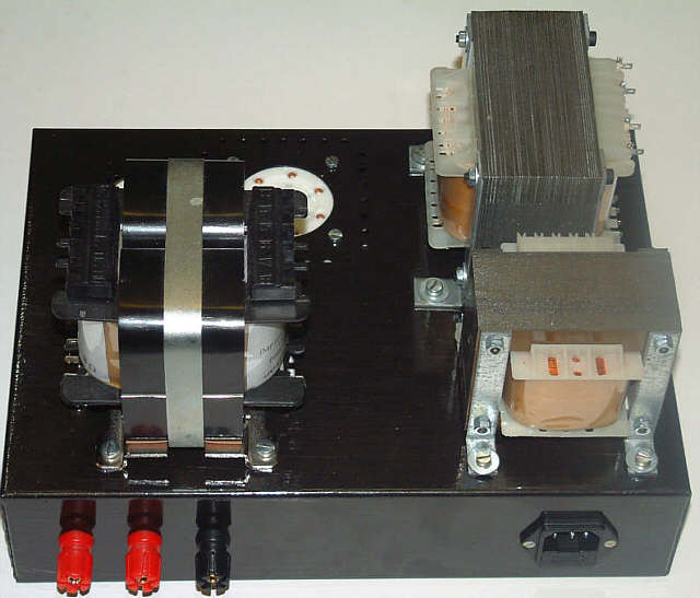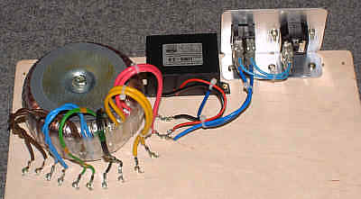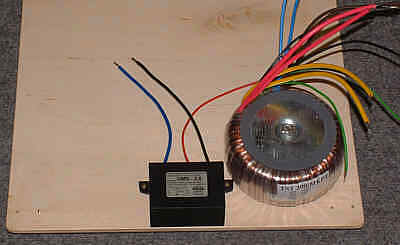 Jak widać zasilacz stanowi pod względem liczby zastosowanych elementów główny składnik wzmacniacza. Pomijając względy funkcjonalne można nawet powiedzieć, że wzmacniacz jest jedynie małym dodatkiem do rozbudowanego zasilacza. Ale teraz na poważnie. Mimo, że jest to układ prototypowy warto poświęcić nieco wysiłku aby elementy służące do połączenia zasilacza z napięciem sieciowym były zamocowane solidnie i bezpiecznie. Dotyczy to gniazda sieciowego, bezpiecznika oraz włącznika. Naprawdę, tych elementów nie radzę mocować metodą 'na pająka'. Możliwość szybkiego wyłączenia wzmacniacza, bez nerwowego poszukiwania, gdzie jest wyłącznik jest naprawdę nie do przecenienia.